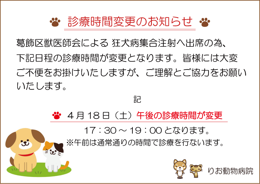 4月18日(土)ですが、葛飾区の狂犬病集合注射へ出席の為、午後の診療時間が変更となります。