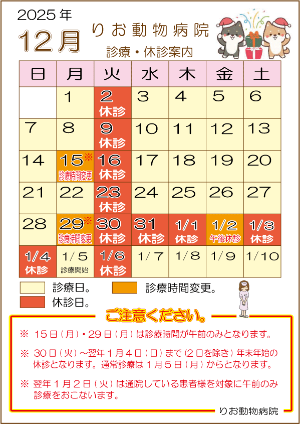 12月度の、診療及び休診日のご案内と合わせ、年末年始のご案内もおこないます。