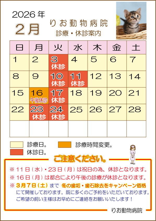※3月7日(土)まで、ワンちゃん猫ちゃんの歯石除去を対象とした冬の歯科キャンペーンを開催中です。既に多くのご予約をいただいております。ご希望の飼い主様はお早めにご連絡ください。